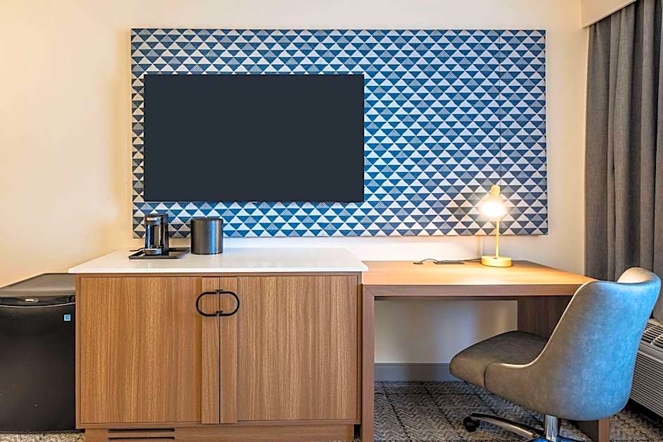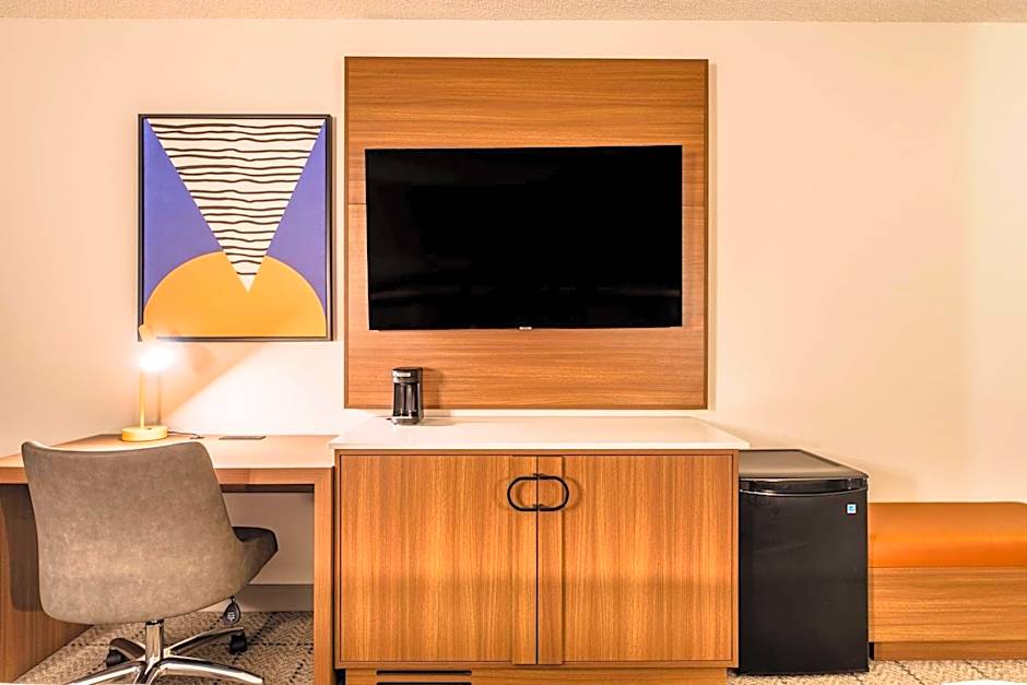 A flat-screen TV is offered in this room. It also has a work desk and coffee machine.